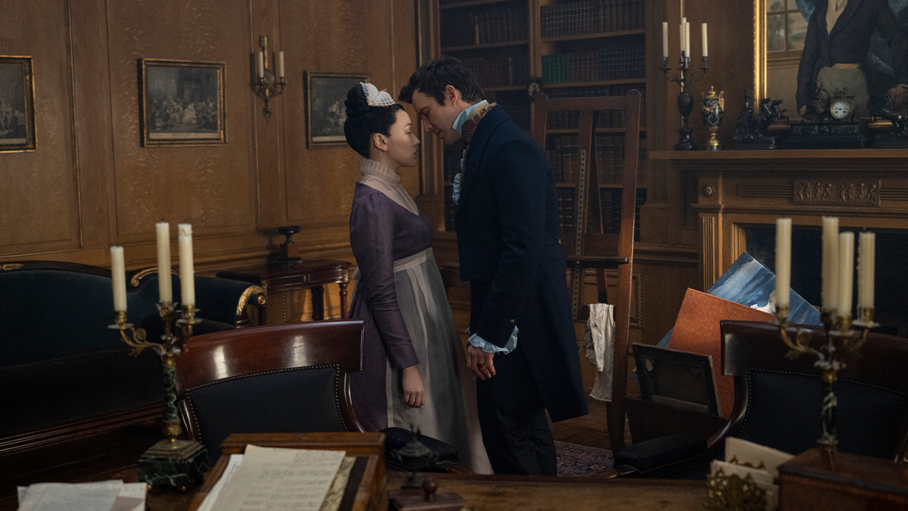 Yerin Ha and Luke Thompson in Bridgerton season four.